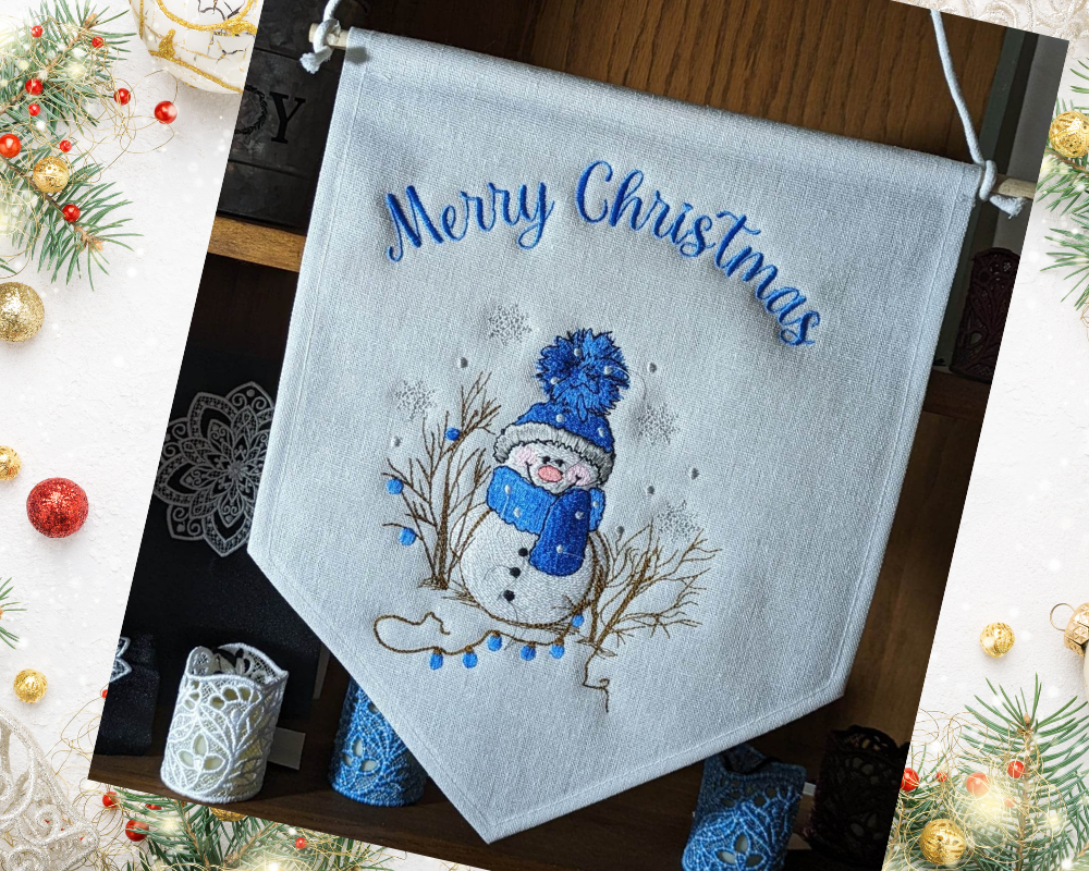 Brighten up your winter decor with this charming banner featuring a snowman in a cozy blue hat and scarf, surrounded by gently falling snowflakes.