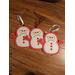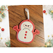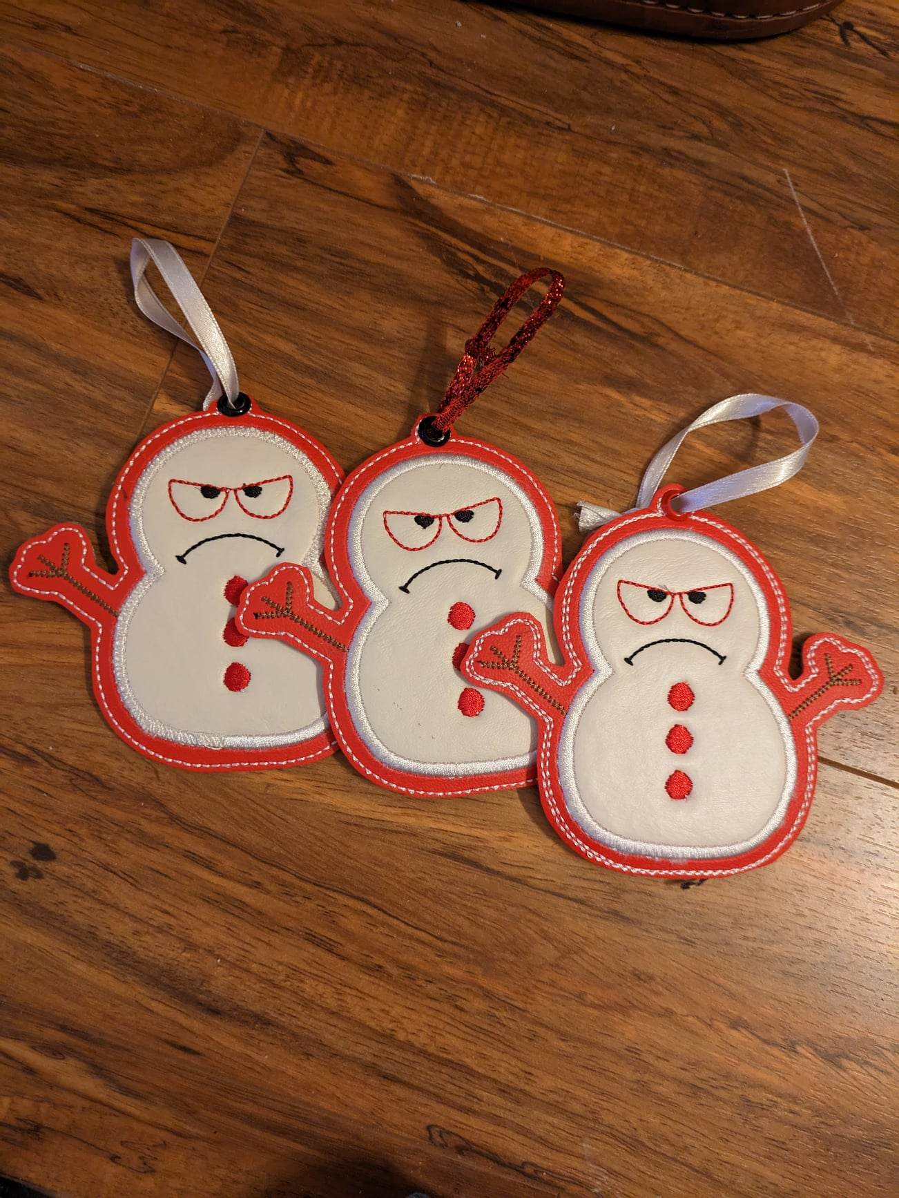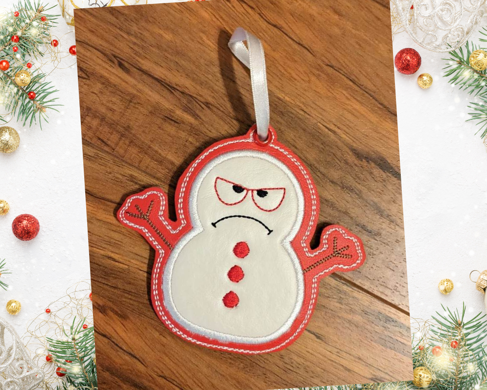 Wouldn't you be grumpy if you didn't have a nose? Even if he looks like he is in a bad mood, you have to admit he is cute. Made with vinyl and a machine embroidered design on the front, this would look so cute hanging from your Christmas tree, or even from your car's rear view mirror! This ornament is red and white, with red buttons. Each snowman measures approximately 4" x 4.5"