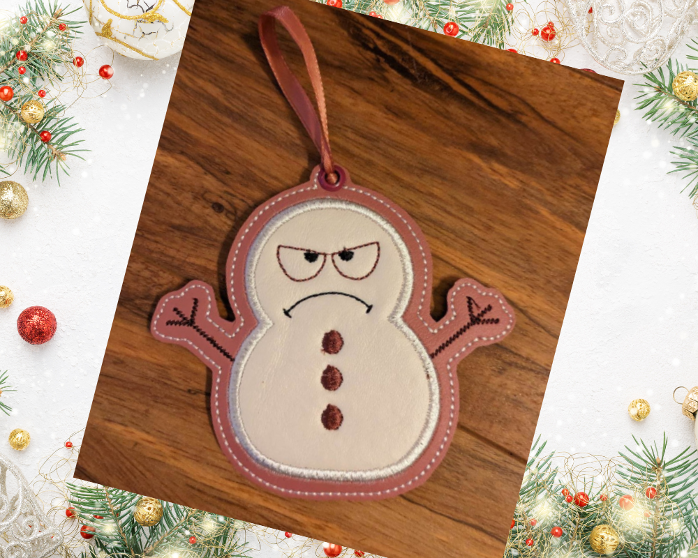 Wouldn't you be grumpy if you didn't have a nose? Even if he looks like he is in a bad mood, you have to admit he is cute. Made with vinyl and a machine embroidered design on the front, this would look so cute hanging from your Christmas tree, or even from your car's rear view mirror! This ornament is mauve and white, with mauve buttons. Each snowman measures approximately 4" x 4.5"