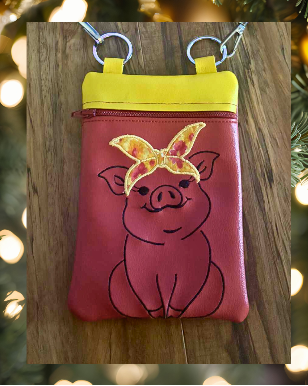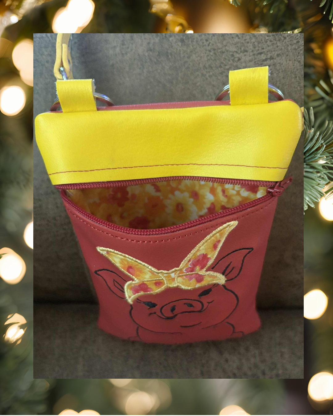 • Secure zipper top with matching tassel • Bright, cheerful yellow accent • Embroidered piggie with personality!