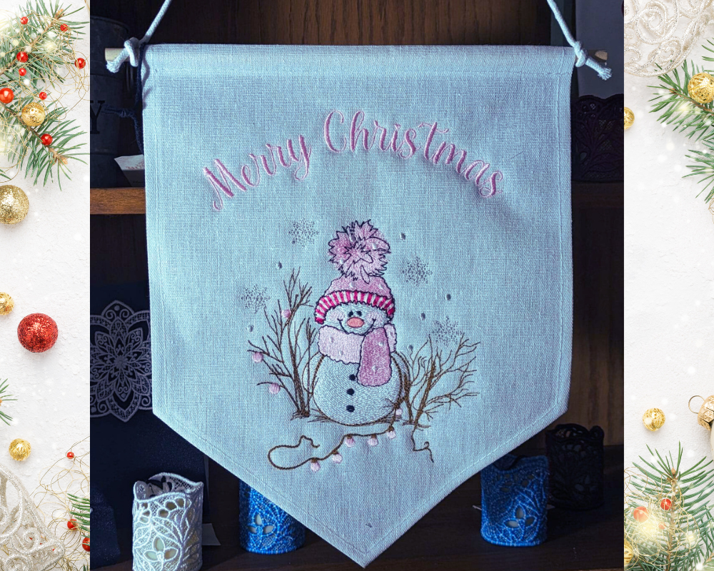 Brighten up your winter decor with this charming banner featuring a snowman in a cozy pink hat and scarf, surrounded by gently falling snowflakes.