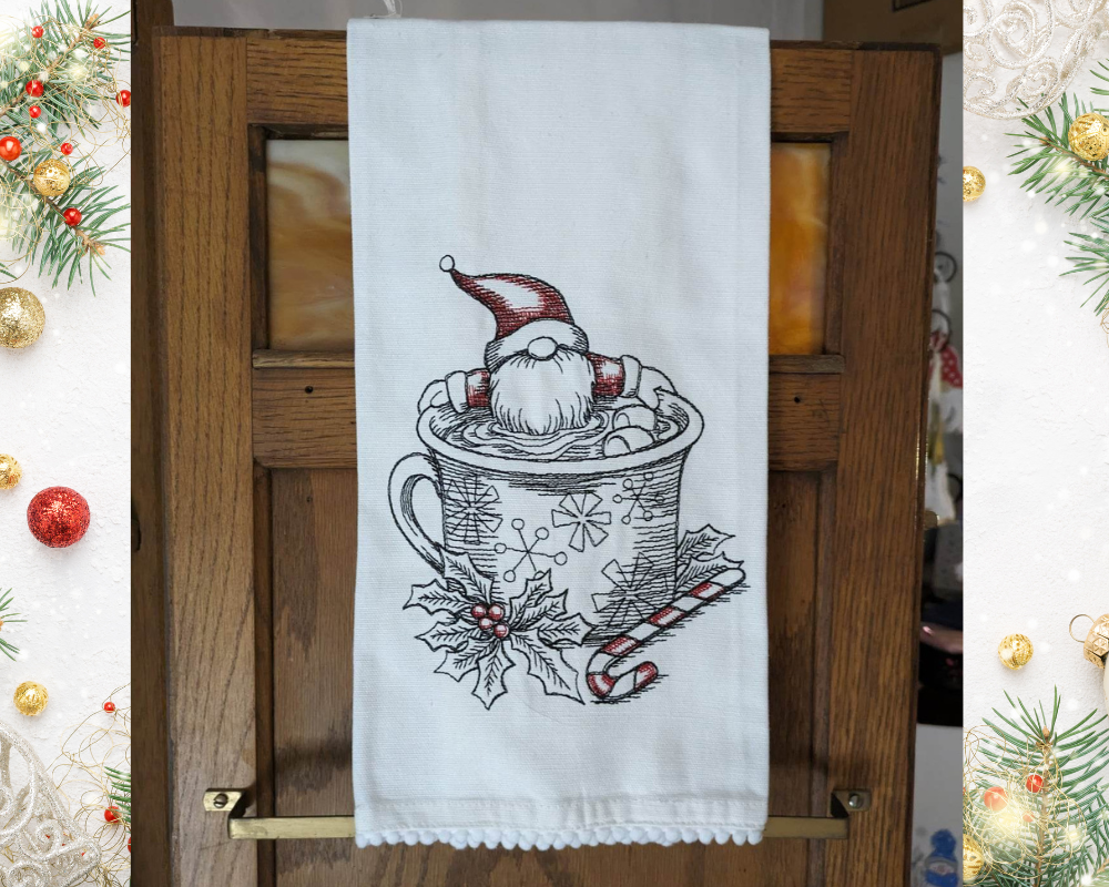 This 100% cotton towel measures 18"x28" and has Santa sitting in a hot chocolate spa. Look for my other listings for matching Santa banner