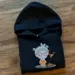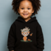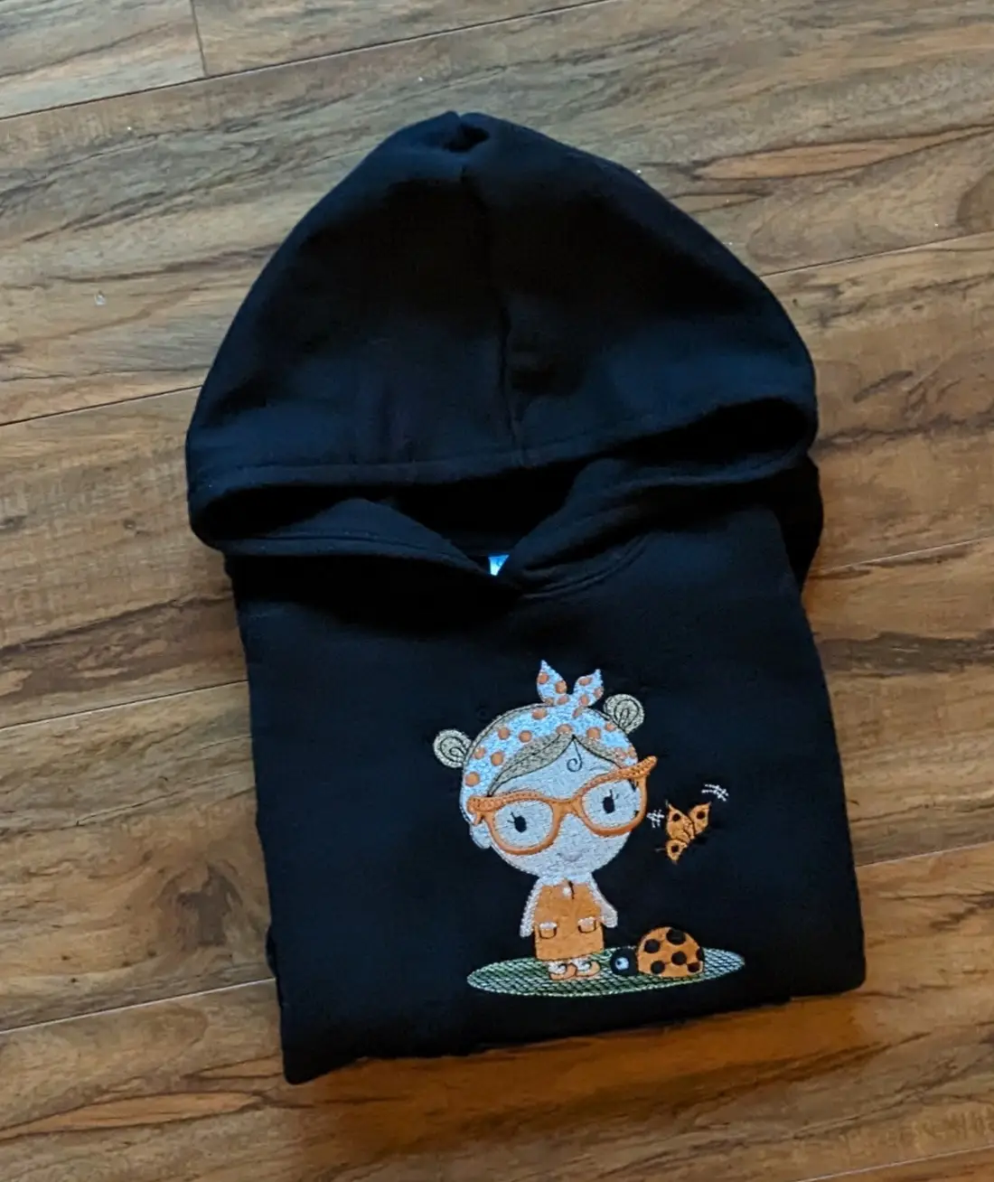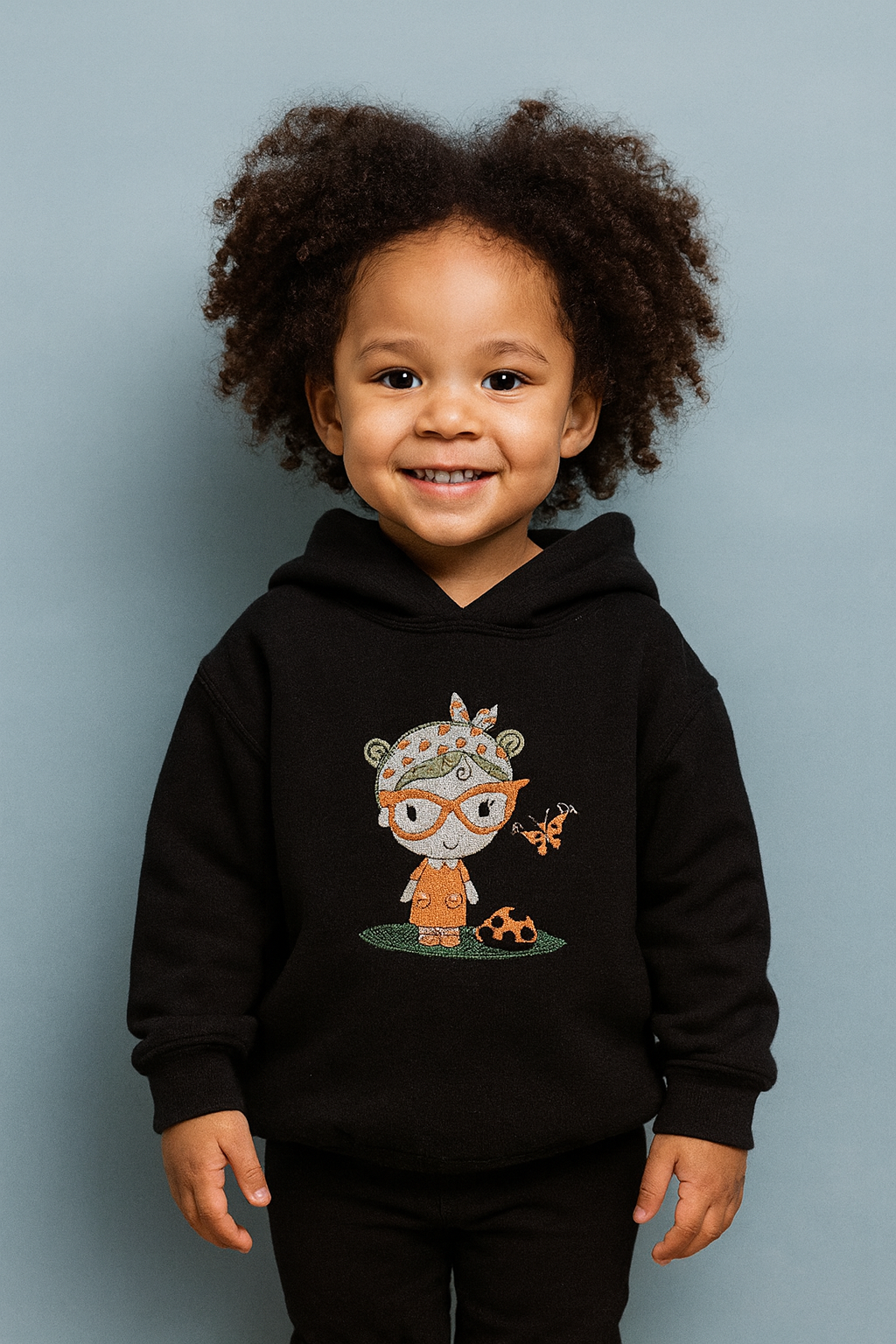 This cozy black hoodie is as sweet as it is comfy! The front features a darling embroidered design of a little girl with orange glasses, a polka-dot headband, a tiny butterfly friend, and a cheerful ladybug at her feet. Every stitch adds personality and charm—perfect for a playful little one who loves cute details.
