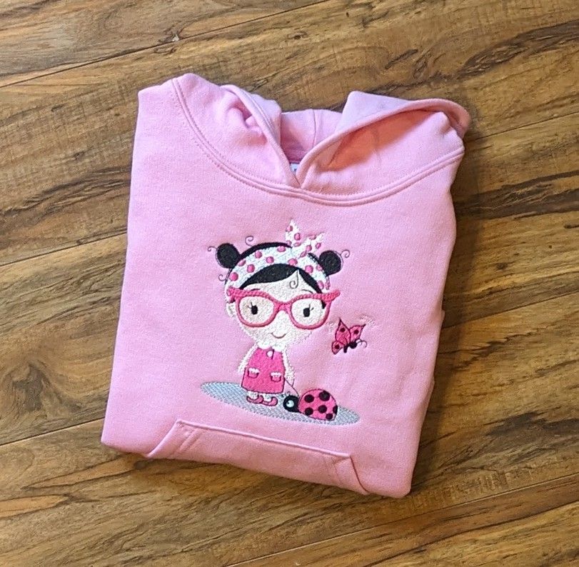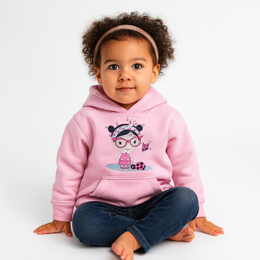 This cozy pink hoodie is as sweet as it is comfy! The front features a darling embroidered design of a little girl with pink glasses, a polka-dot headband, a tiny butterfly friend, and a cheerful ladybug at her feet. Every stitch adds personality and charm—perfect for a playful little one who loves cute details.