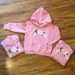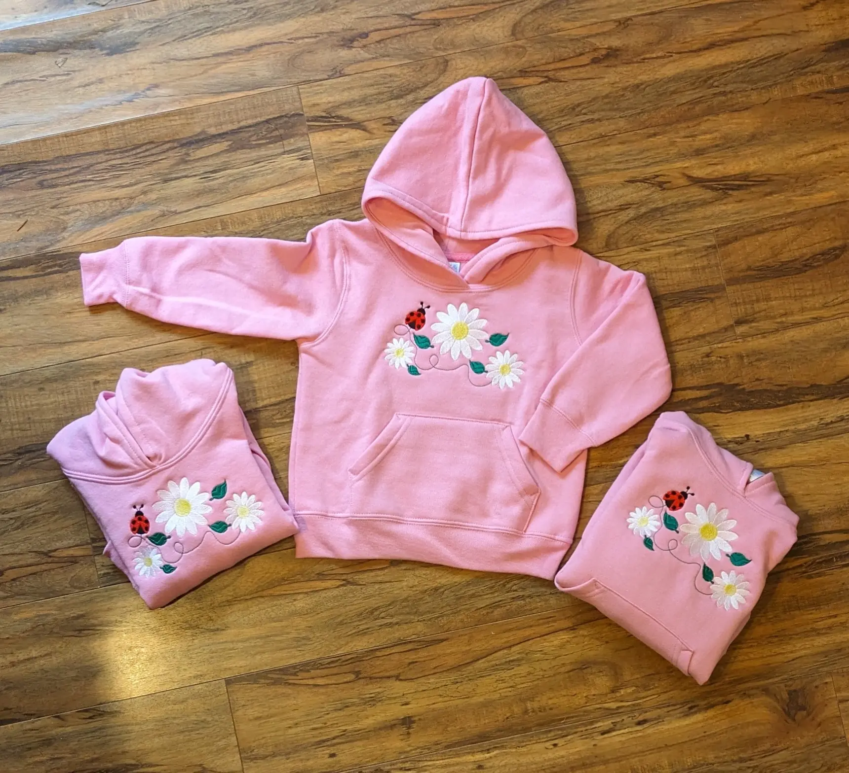 Brighten up your wardrobe with this charming pink hoodie, made from a soft cotton/poly blend. It features an adorable embroidered design of vibrant red daisies and a playful ladybug on the front.